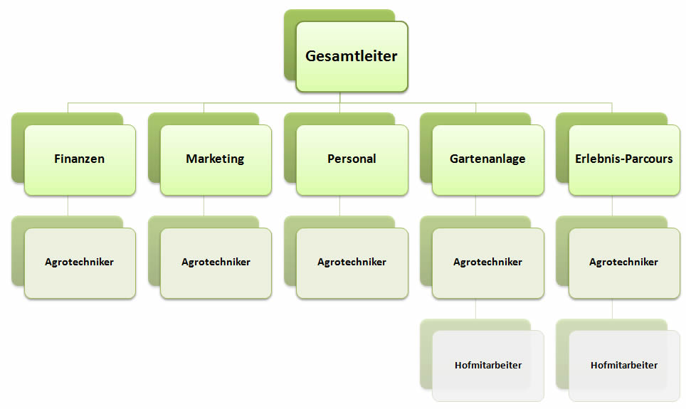Um einen organisierten und strukturierten Ablauf der bevorstehenden Arbeiten zu gewährleisten wurde ein Leitungsteam von 10 Personen erstellt. Das Leitungsteam wurde in 5 Bereiche (siehe Organigramm) aufgeteilt. Den jeweiligen Bereichen sind die restlichen 20 Agrotechniker eingeteilt.